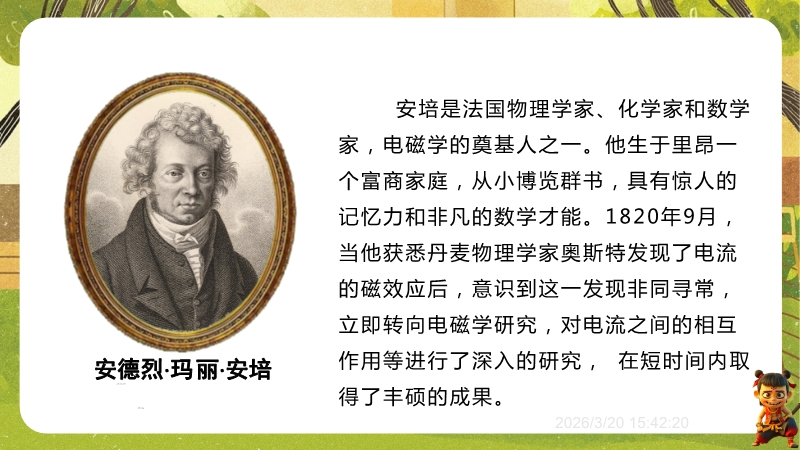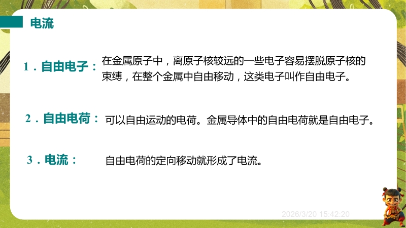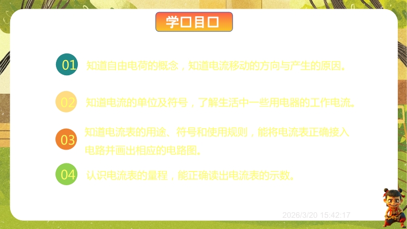 【内容简介】课件聚焦“电流 电流表”核心内容,涵盖电流的形成、单位、方向及电流表的认识与使用。通过验电器实验观察导入,引导学生从电荷转移现象切入,逐步构建电流概念、单位换算、方向规定到测量工具的知识脉络,搭建清晰的物理观念学习支架。其亮点在于融合科学史(安培介绍)、生活实例(用电器电流表)与实验操作(电流表试触、错误分析),以科学探究培养规范操作能力,借科学思维中的问题解决(例题错误辨析)强化应用。学生能在具象化学习中深化物理观念,教师可通过结构化练习与分层设计提升教学效率。