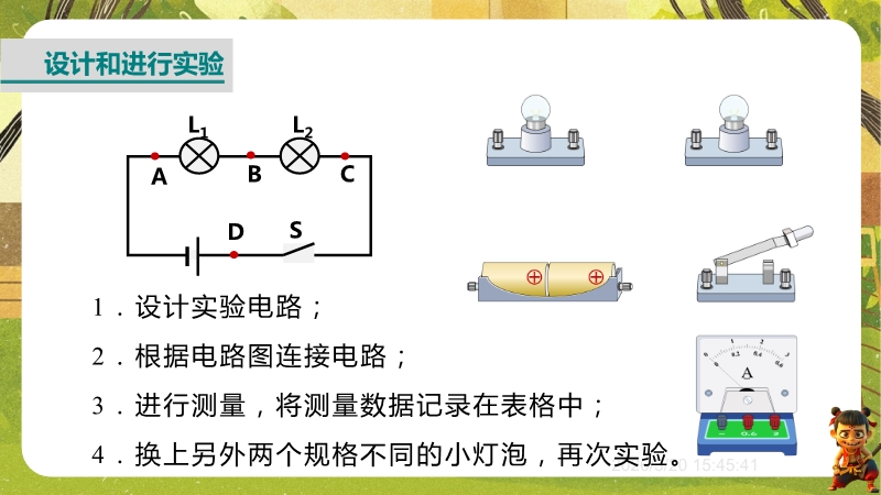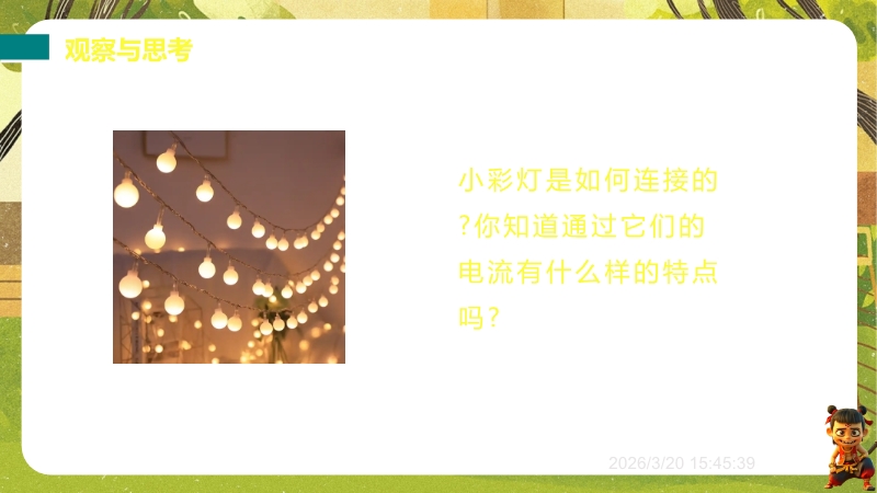 【内容简介】课件聚焦串、并联电路中电流的关系,通过“小彩灯连接方式”的观察与思考导入,引导学生经历猜想、实验设计、数据收集与分析的探究过程,结合练习与规律总结,构建从生活现象到物理规律再到实际应用的学习支架。其亮点在于以科学探究为核心,通过更换不同规格灯泡多次实验培养科学思维,结合小彩灯、插线板等生活实例深化物理观念。采用探究式教学与对比表格总结规律,助力学生提升实验能力和问题解决能力,也为教师提供系统教学资源,提高课堂效率。