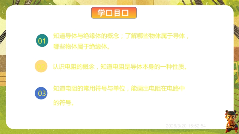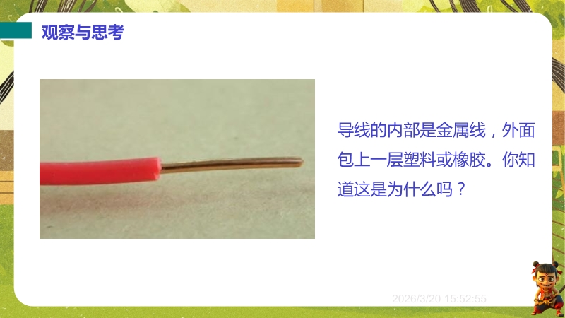 【内容简介】课件聚焦“不同物质的导电性能”,涵盖导体、绝缘体、半导体及电阻等核心知识点。通过导线结构提问导入,结合实验观察不同物质导电情况,引导学生从现象到本质构建知识脉络,形成学习支架。其亮点在于以科学探究为主线,通过实验(如加热玻璃观察导电变化)和转换法(灯泡亮度判断导电能力),融入中考题和安全用电案例,培养学生物理观念与科学思维,助力学生理解概念,教师可高效开展教学。