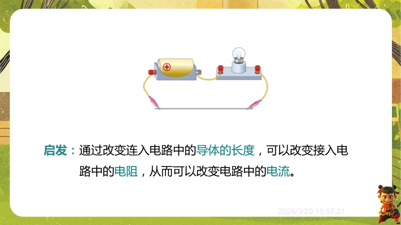 【内容简介】聚焦“变阻器”核心内容,涵盖滑动变阻器(构造、原理、接法、参数)与电阻箱(结构、读数)。通过“音响台灯调节”生活现象导入,结合“铅笔芯实验”探究灯泡亮度变化,引导学生从生活问题到实验现象,提炼“改变导体长度可改变电阻”原理,搭建从生活到物理的学习支架,衔接欧姆定律中电阻对电流的影响。课件亮点在于融合科学探究与科学思维:“想想做做”实验、动画及视频演示滑动变阻器使用,让学生亲历探究过程;练习题含故障分析(灯泡亮度不变原因)、实际应用(调光台灯电路连接),培养科学推理与问题解决能力。课堂小结系统梳理知识,助学生形成物理观念,丰富的多媒体资源与分层习题也为教师高效教学提供支持。