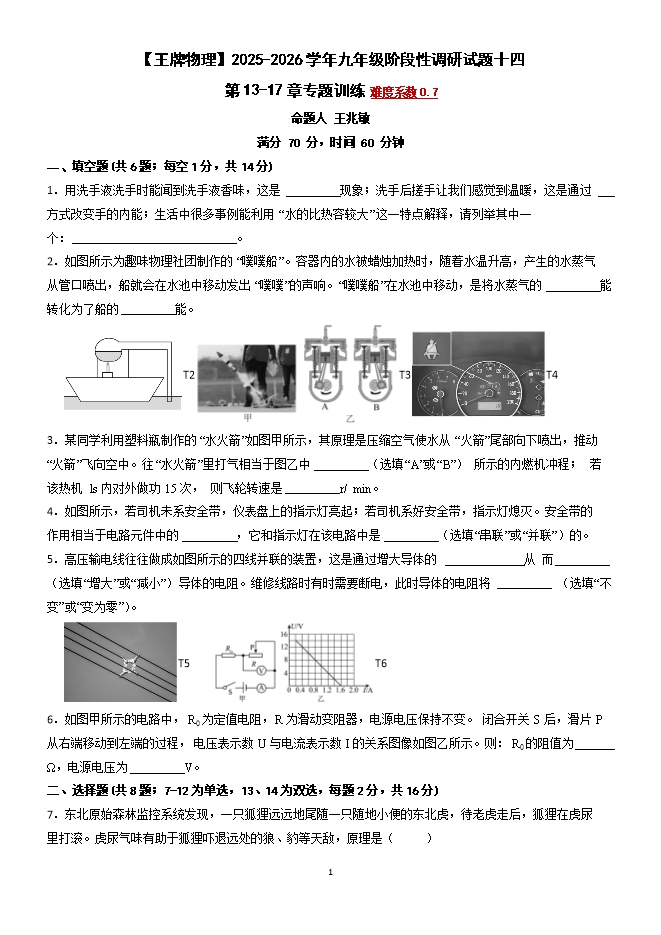 【内容简介】第13-17章 专题训练--2025-2026学年人教版九年级阶段性调研试题十四(原卷版和解析版)【王牌物理】