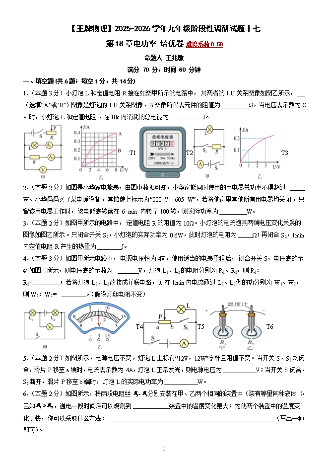 【内容简介】第18章 电功率 培优训练--2025-2026学年九年级阶段性调研试题十七(人教版)【王牌物理河南专版】
