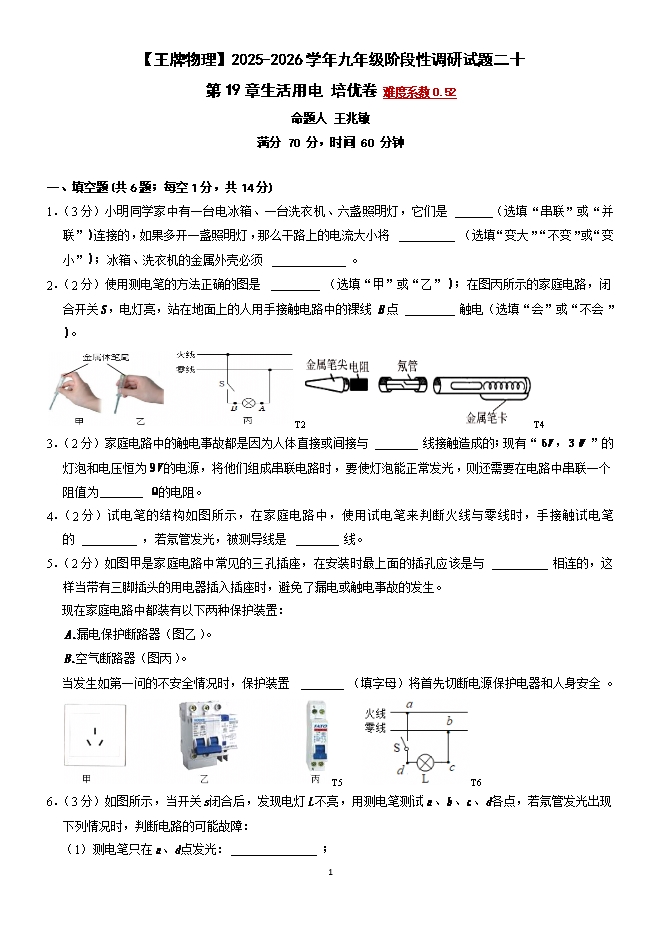 【内容简介】第19章 生活用电 培优训练--2025-2026学年九年级阶段性调研试题二十(人教版)【王牌物理河南专版】