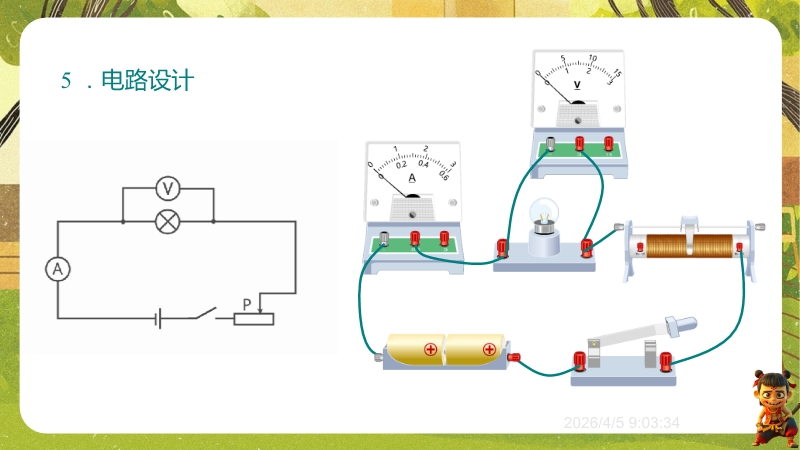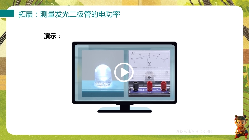 【内容简介】课件聚焦“测量小灯泡的电功率”核心知识点,通过提问“怎么测量电功率”引出P=W/t和P=UI两种方法,引导学生选择P=UI作为实验原理,衔接实验目的、器材与电路设计,构建从公式辨析到实验操作的学习支架。其亮点在于以完整科学探究流程(设计、操作、记录、评估)培养科学探究能力,通过不同电压下功率测量及数据记录,帮助学生建立“实际功率决定亮度”的物理观念,拓展题结合串联并联电路分析强化科学推理。学生能深化对电功率本质的理解,教师可借助系统实验方案与习题提升教学效率。
