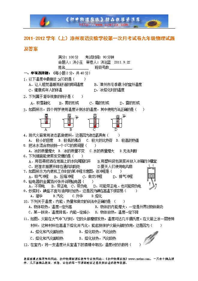 安徽省胜泉中学2011年八年级第一学期物理第一次月考试题及答案(沪科版)