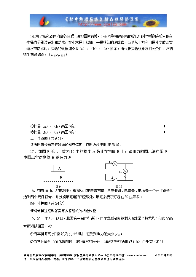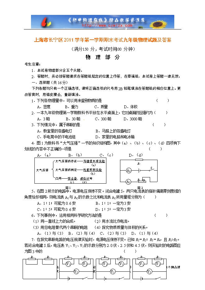 上海市长宁区2011学年第一学期期末考试九年级物理试题及答案