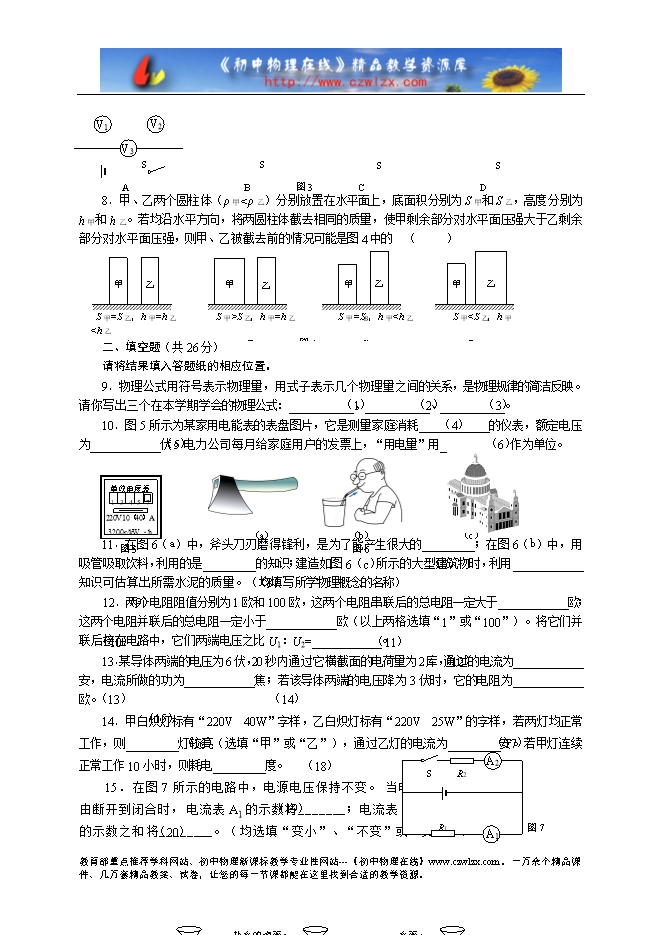 7.在探究串联电路的电压规律实验时,电源电压保持不变。已知R1=R2;R3=R4,且R1?R3。若闭 合电键S后,电压表V1、V2、V3的示数分别为2.0伏、2.5伏和4.5伏,则实验时的电路图应为图3中的 ( )