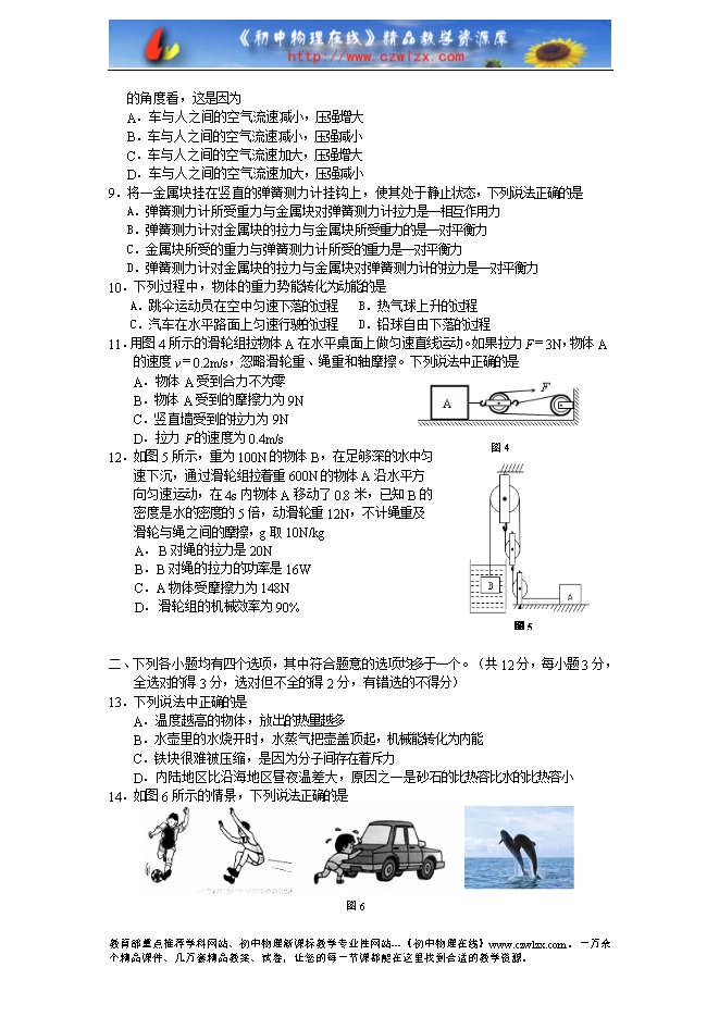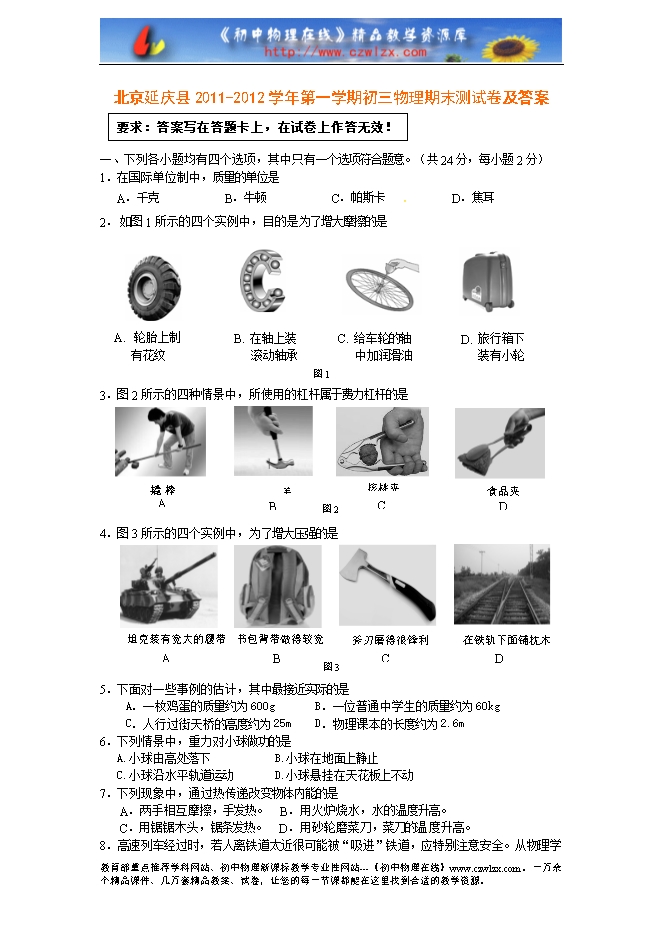 北京市延庆县2011-2012学年第一学期初三物理期末测试卷及答案