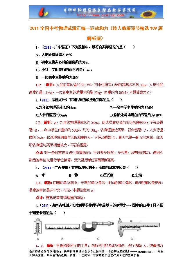 2011全国中考物理试题汇编—力和机械(1-3节)(按人教版章节精选66题解析版)