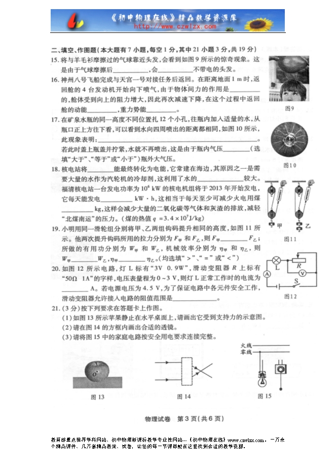 【内容简介】2012年福州市初中毕业会考、高级中等学校招生考试物理试题及评分标准(扫描版,附视频点评)