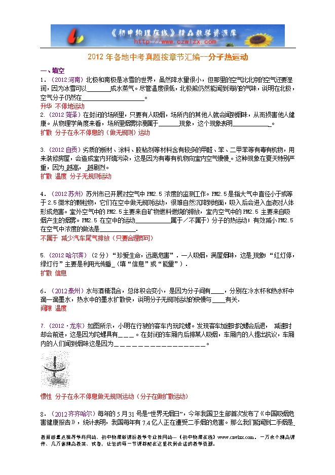 3.(2012自贡)劣质的板材、涂料、胶粘剂等材料含有较多的甲醛、笨、二甲苯等有毒有机物,用来装修房屋,会造成室内环境污染,这是因为有毒有机物向室内空气慢慢 。这种现象在夏天特别严重,因为 越高, 越剧烈。