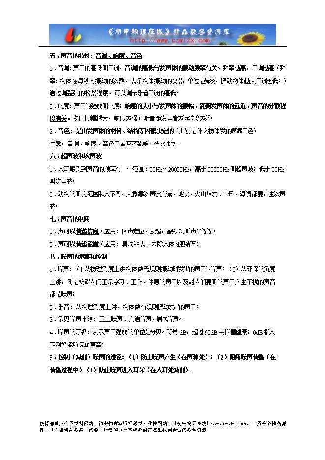 4、声速:物体在每秒内传播的距离叫声速,单位是m/s;声音在空气中速度为340m/s;