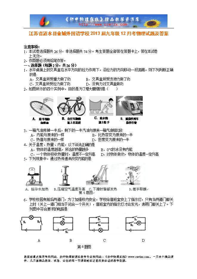 江苏省涟水县金城外国语学校2013届九年级12月考物理试题及答案