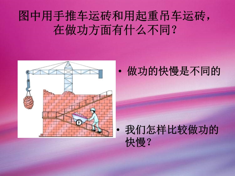 建筑工地上要把砖送到楼顶,或用起重机搬运,或用工人搬运,不管怎样搬运,都是克服重力做功,那么运送砖块所做的功我们可以用公式_________来计算.运送同样多的砖,起重机和工人所做的功_______(填“相同”或“不同”),但是工人所用的时间_______(填“长”或“短”),所以工人做功较______(填“快”或“慢”).