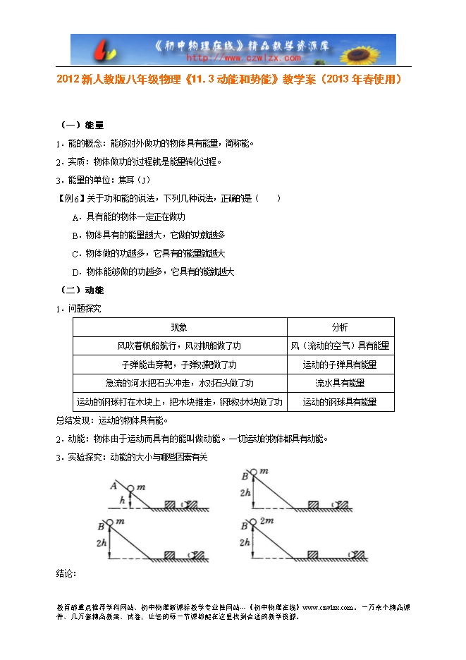 2012新人教版八年级物理《11.3动能和势能》教学案(2013年春使用)