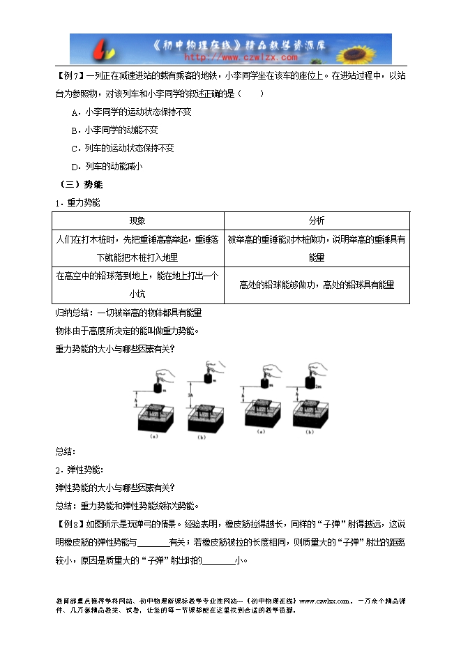 2.动能:物体由于运动而具有的能叫做动能。一切运动的物体都具有动能。