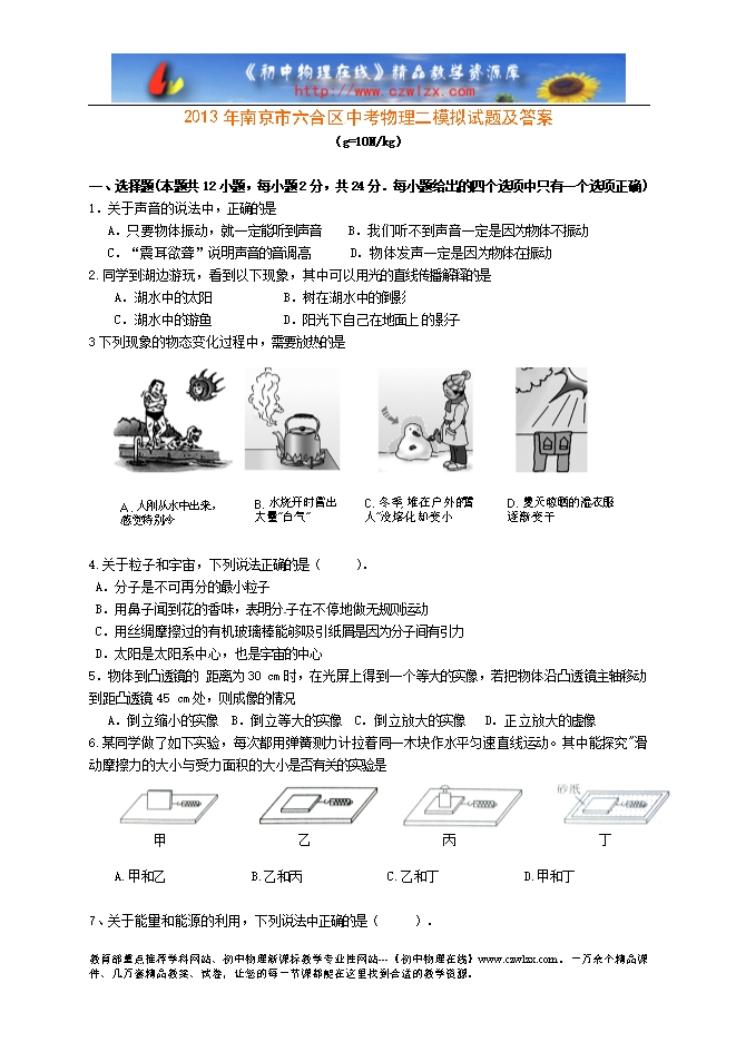 2013年南京市六合区中考物理二模拟试题及答案