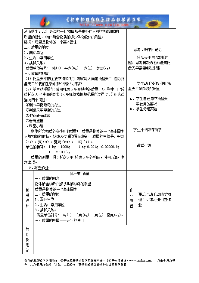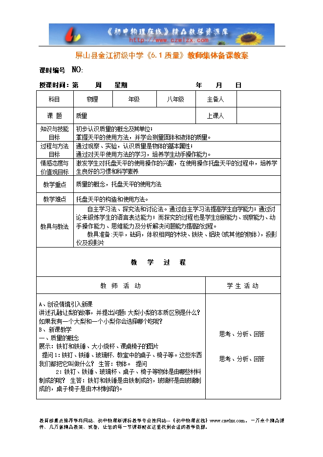 屏山县金江初级中学《6.1质量》教师集体备课教案