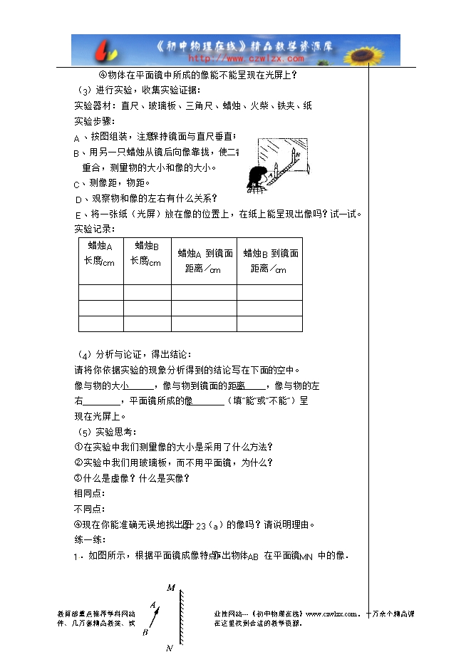 平面镜、直尺、玻璃板、三角尺、蜡烛、 火柴、铁夹、白纸等