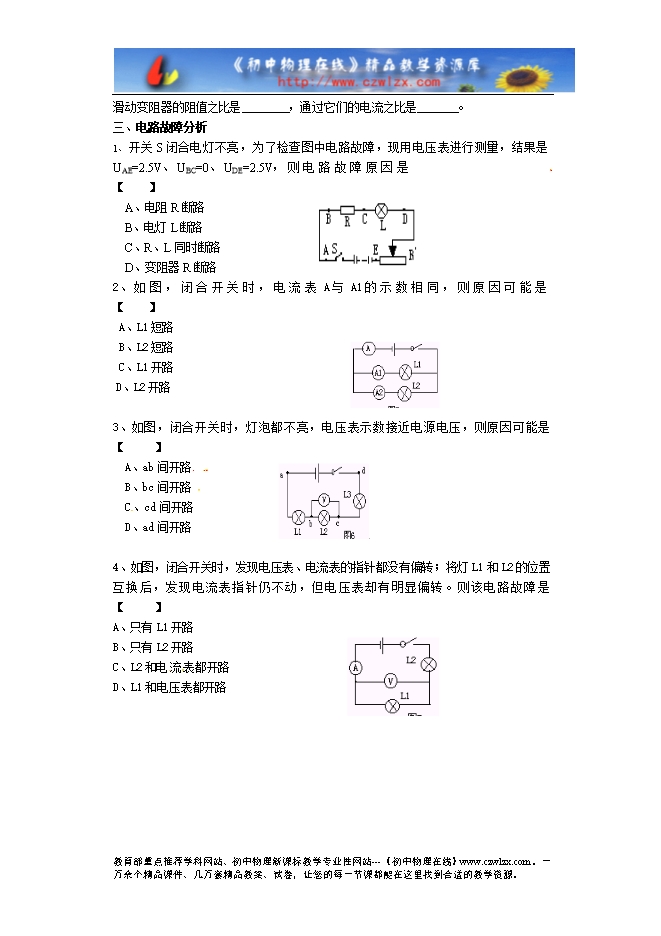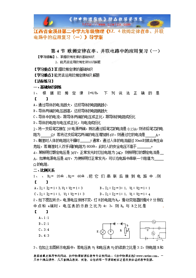 江西省金溪县第二中学九年级物理《17.4欧姆定律在串、并联电路中的应用复习(一)》导学案