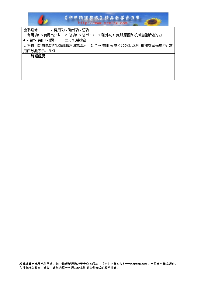 教学难点 在实例中有用功、额外功、总功的确定,对影响机械效率的因素的理解。