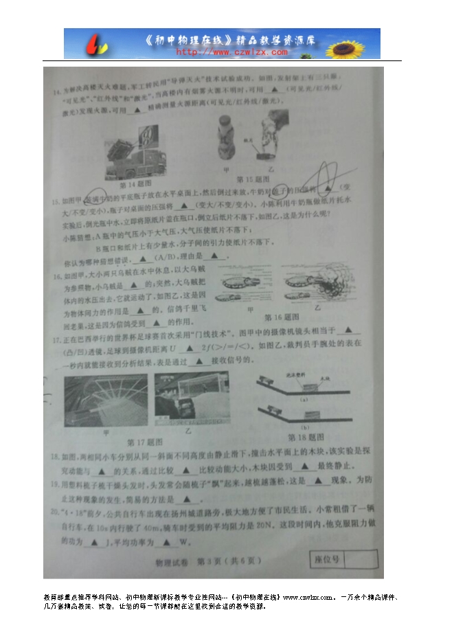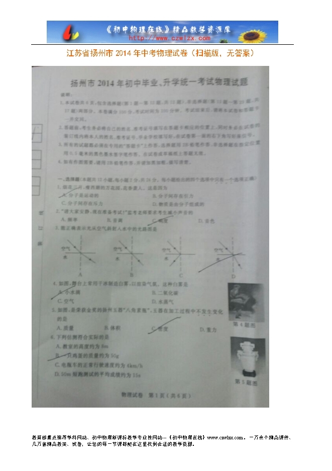 【内容简介】江苏省扬州市2014年中考物理试卷(扫描版,无答案)