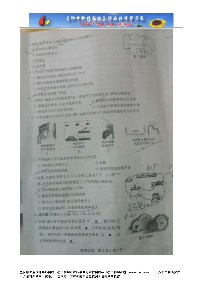 江苏省扬州市2014年中考物理试卷(扫描版,无答案)