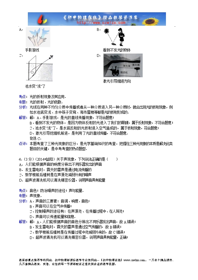 3.(3分)(2014•益阳)下列情景中,属于光的折射现象的是( )