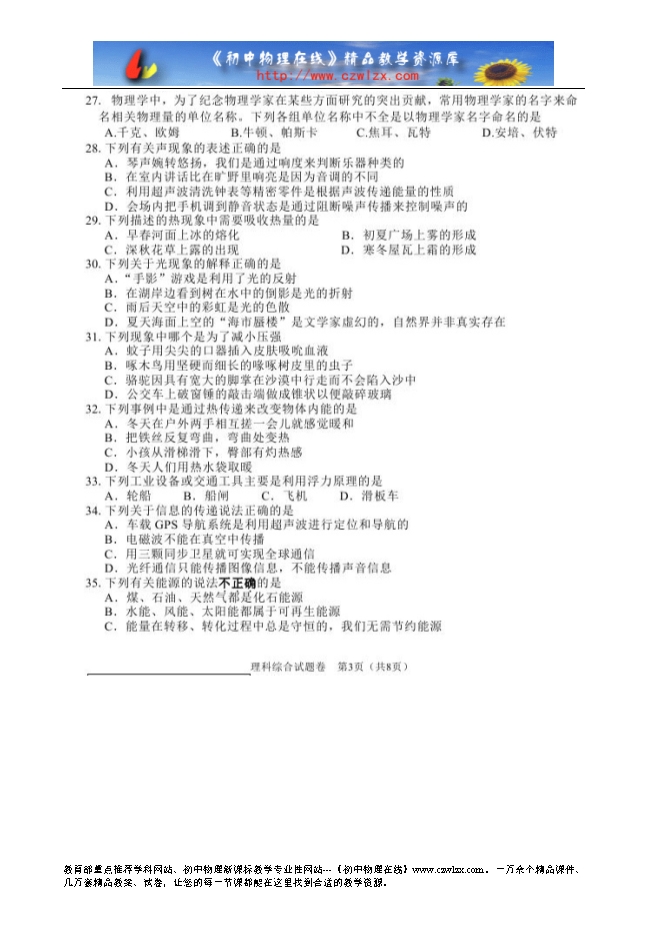 【内容简介】湖北省黄石市2014中考理综(物理部分)试题(扫描版,含答案)