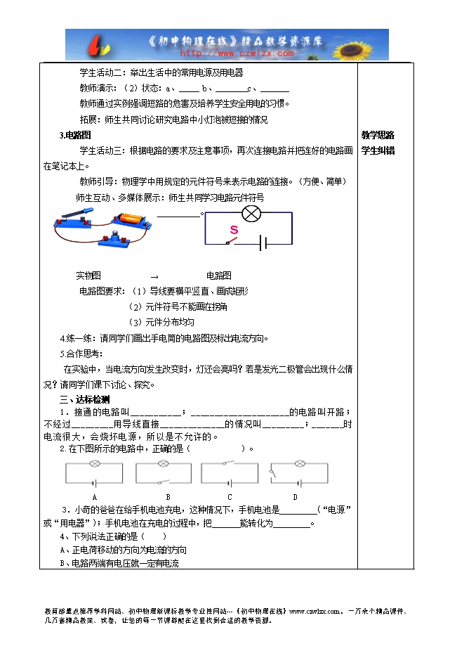 本节内容是这章的重点教学内容,由“电流、电路的构成、电路图和通路、断路、短路”四个部分组成。学习重点是会连接电路、会画电路图、能识别断路、通路、短路。学习难点是对电流概念的理解、对短路的理解和识别、让学生规范地画出电路图。