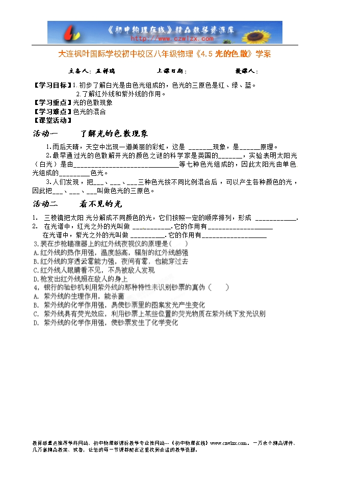 大连枫叶国际学校初中校区八年级物理《4.5光的色散》学案
