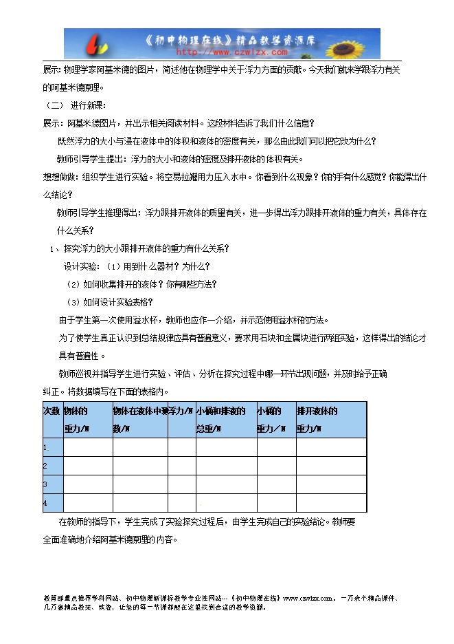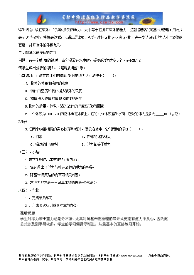 石家庄市卓达学校八年级物理下册《10.2阿基米德原理》教案(人教版)