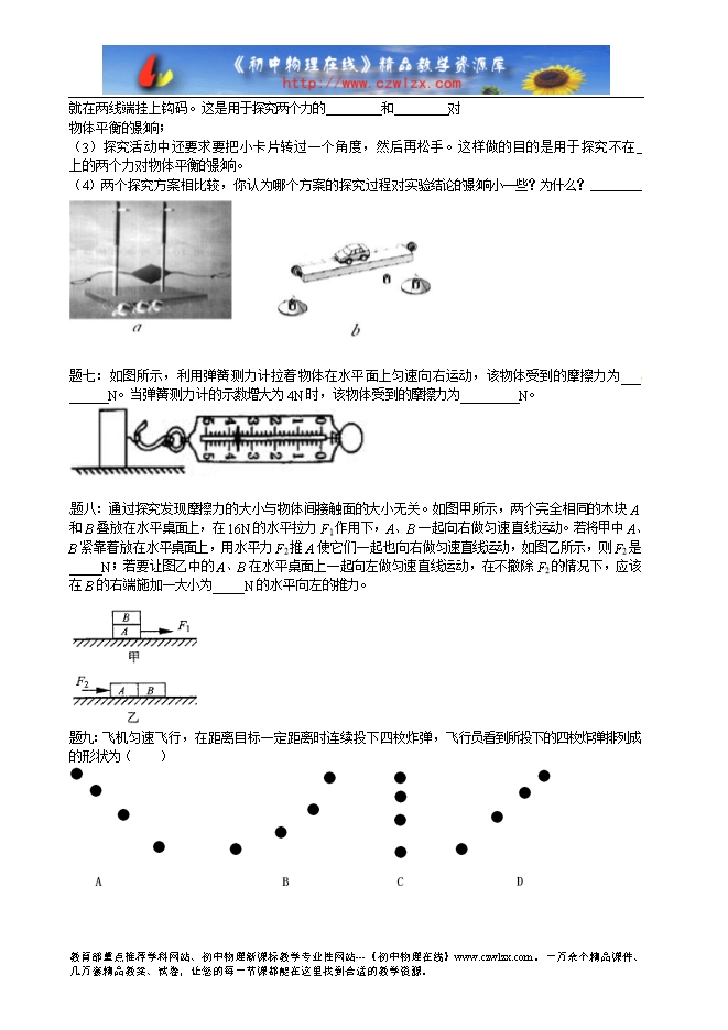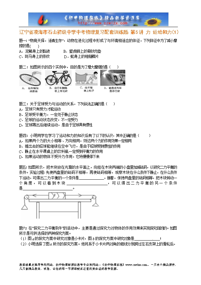 题五:如图所示,把木块放在光滑的水平面上,向挂在木块两端的小盘里加减砝码,以研究二力平衡的条件。实验过程:先使两盘里的砝码不相等,再使砝码相等,观察木块在什么条件下静止,在什么条件下运动,可得出二力平衡的一个条件是 ,接着,保持两盘里的砝码相等,把木块转动一个角度,可以看到木块 ,可以得出二力平衡的另一个条件是 。