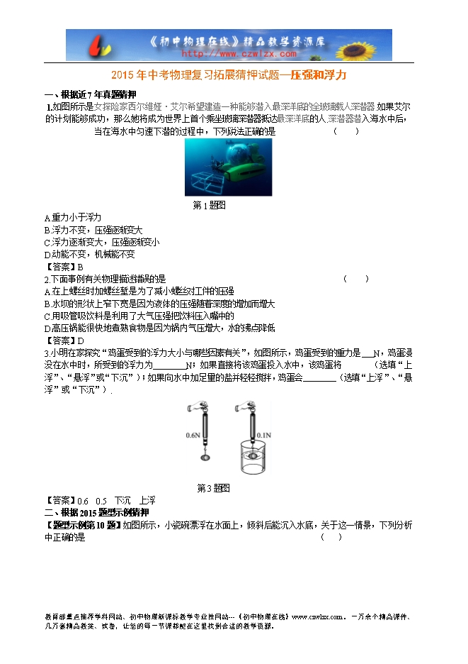 2015年中考物理复习拓展猜押试题—压强和浮力
