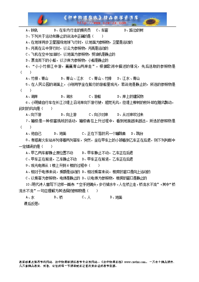 1、请你根据下面的描述,判断下面标点的物体分别是以什么作为参照物,并把它写在后面的横线上: