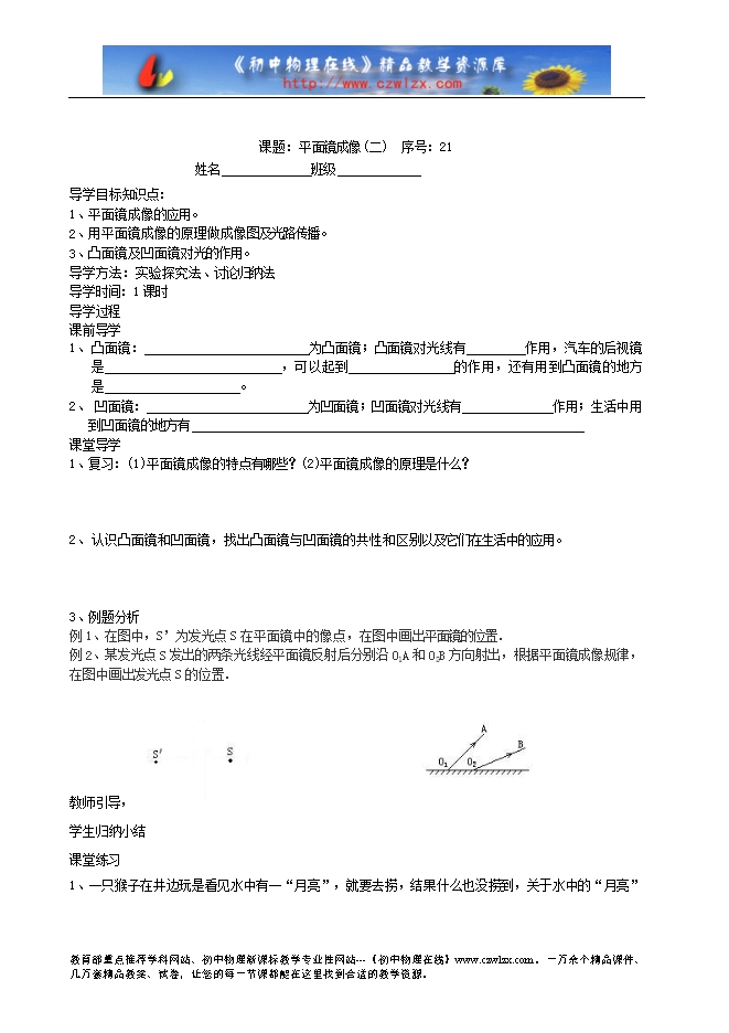 2、 平面镜成像原理是 ,平面镜的像实际上是来自物体的光经平面镜 。