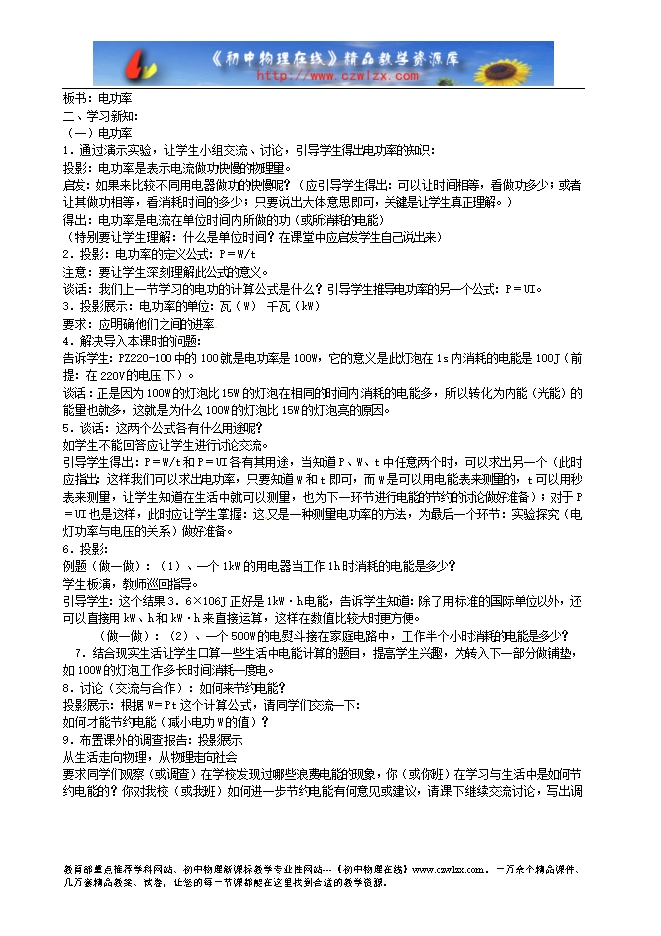 知识与技能:深刻理解电功率是表示消耗电能的快慢,知道电功率的单位是W。会用电功率的公式P=W/t=UI进行简单的计算。掌握额定功率和实际功率的意义。