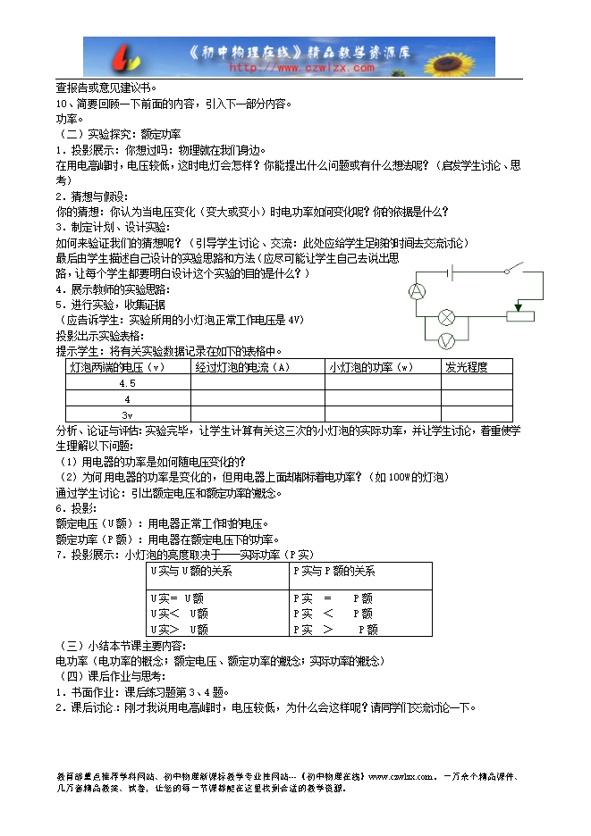 学生准备:观察家庭中常用的灯泡上面的数据;学生用稳压电源,直流电流表、电压表、导线若干、开关、额定 电压为4V的小灯泡一个。节能型电灯一只(功率16w)教学过程: