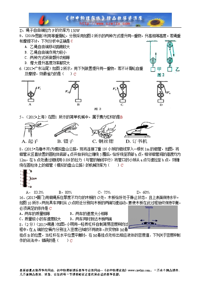 【内容简介】 一、选择题 11. (2015?邵阳)如图,下列工具中属于费力杠杆的是B 6.(2分)(2015?黑龙江)简单机械在我们的生活中应用很广泛.下面是使用简单机械匀速提升同一物体的四种方式(不计机械重和摩擦),其中不省力的是(  )C   A. B. C. D. 7.(2分)(2015?黑龙江)如图所示,工人用250N的力将重400N的物体匀速提升2m,共用了10秒,若在此过程中(忽略绳重和摩擦).下列说法正确的是(  )D   A.绳子自由端移动的距离是6m B. 动滑轮的重是10N   C.工人做功的功率是80W D. 滑轮组的机械效率是80% 9.(3分)(2015?庆阳)如图所示的简单机械中,在使用中费力杠杆的是(  )D   A.核桃夹 B.自行车车把  C.活塞式抽水机抽水 D.扫帚 11.(3分)(2015?庆阳)用如图所示的滑轮或滑轮组,将同一物体匀速提高h,最省力的是(滑轮重不计)(  )D   A. B. C. D. 9、(2015?长春)工人师傅利用如图所示的装置匀速提升重物,不计绳重和摩擦,下列说法正确的是 ( )D A、增大提升重物的速度,可以增大有用功 B、减小定滑轮的重力,可以减小额外功 C、增大提升重物的高度,可以提高机械效率 D、减小动滑轮的重力,可以提机械效率 ....... 下载word文档附件