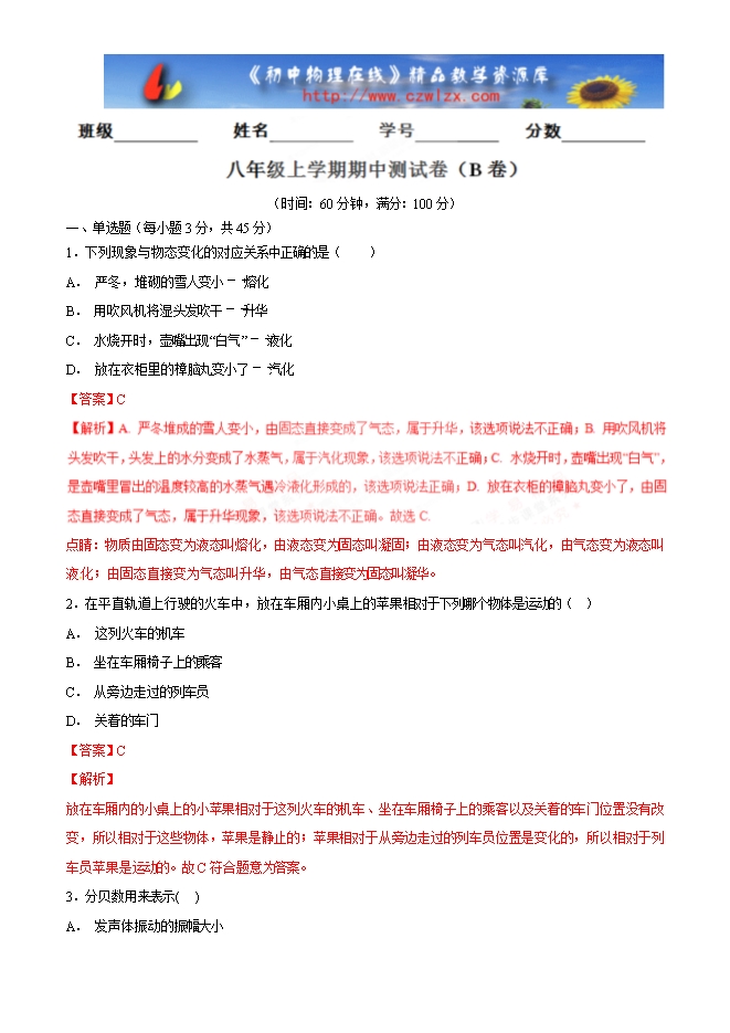 - 1666宁夏中宁二中2015-2016学年八年级上学期期中考试物理试卷(新课标北师大版2015年11月,无答案)