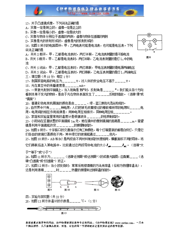 8.如图所示,一束光线射向凸透镜经折射后射到一个平面镜上.请在图中画出射向凸透镜的入射光线和经平面镜反射后的反射光线,并标出反射角的度数.