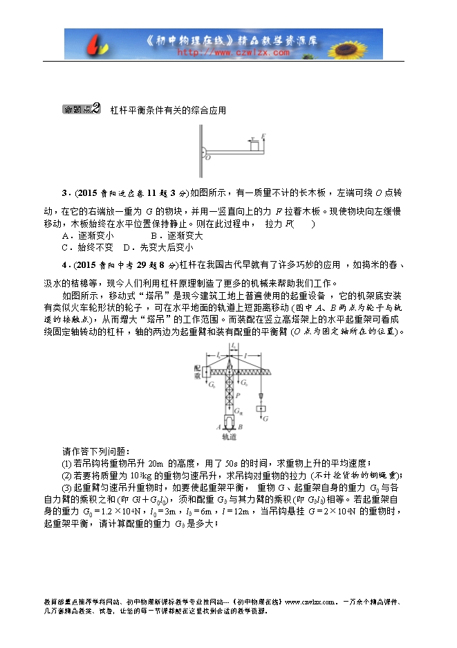 3.(2015贵阳适应卷11题3分)如图所示,有一质量不计的长木板,左端可绕O点转动,在它的右端放一重为G的物块,并用一竖直向上的力F拉着木板。现使物块向左缓慢移动,木板始终在水平位置保持静止。则在此过程中,拉力F( )