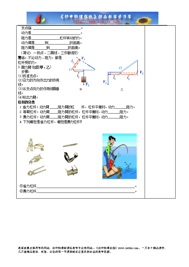1、 能识别出杠杆,并能准确找出支点、动力、阻力、动力臂、阻力臂。