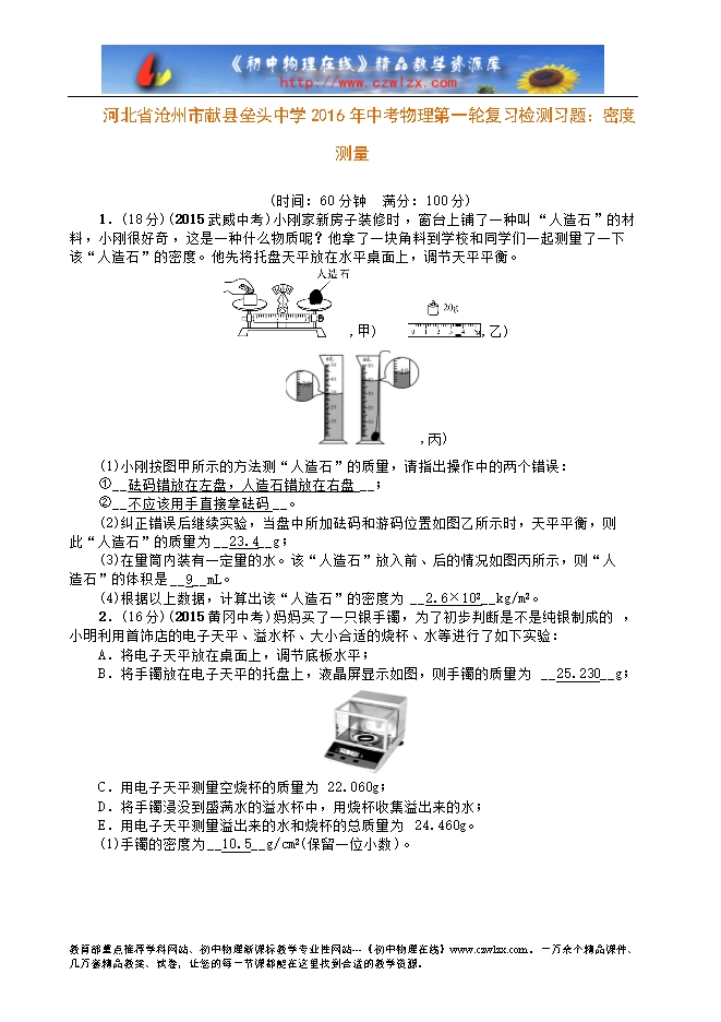 【内容简介】1.(18分)(2015武威中考)小刚家新房子装修时,窗台上铺了一种叫“人造石”的材料,小刚很好奇,这是一种什么物质呢?他拿了一块角料到学校和同学们一起测量了一下该“人造石”的密度。他先将托盘天平放在水平桌面上,调节天平平衡。