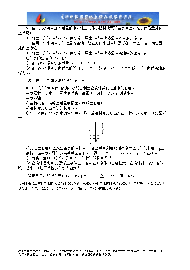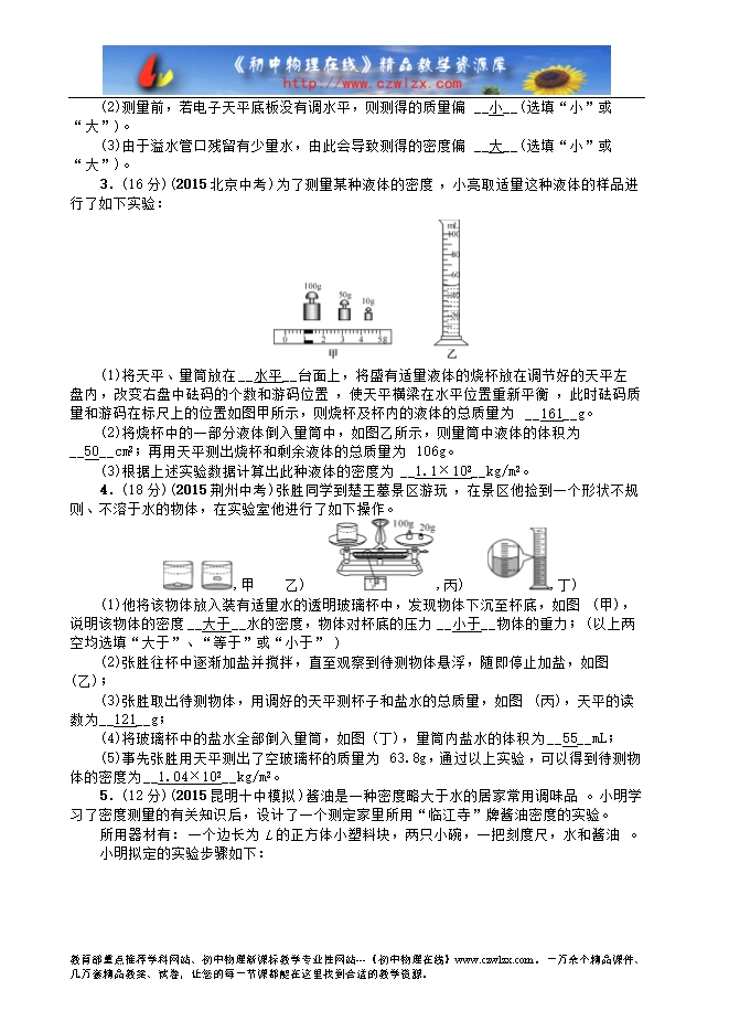 河北省沧州市献县垒头中学2016年中考物理第一轮复习检测习题:密度测量