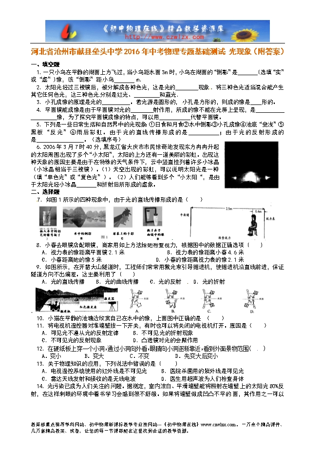 河北省沧州市献县垒头中学2016年中考物理专题基础测试:光现象(附答案)