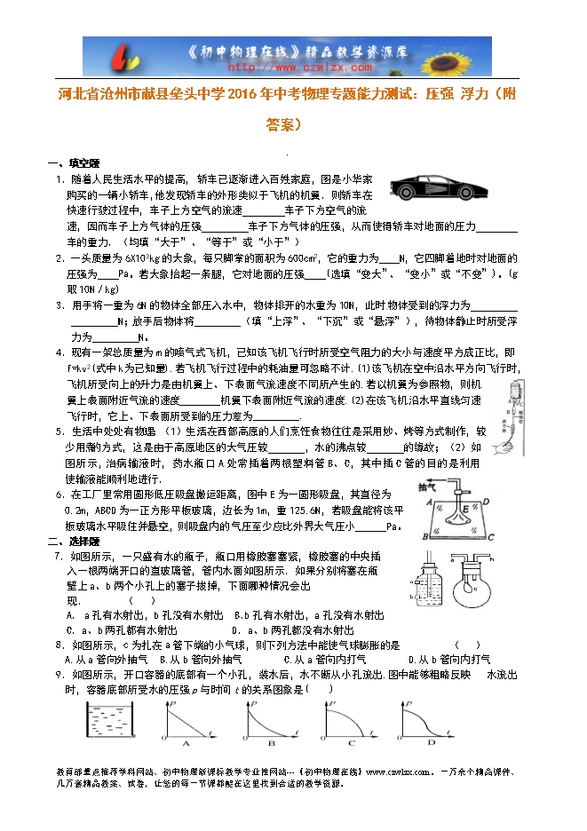 河北省沧州市献县垒头中学2016年中考物理专题能力测试:压强 浮力(附答案)