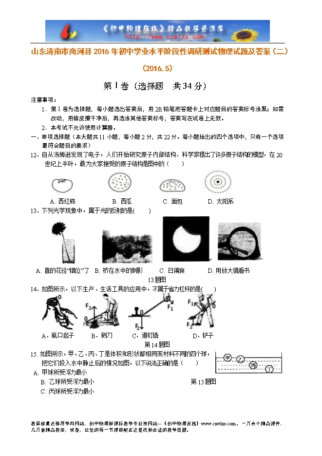 【内容简介】 第Ⅰ卷(选择题 共34分) 注意事项: 1.第Ⅰ卷为选择题,每小题选出答案后,用2B铅笔把答题卡上对应题目的答案标号涂黑;如需改动,用橡皮擦干净后,再选涂其他答案标号,答案写在试卷上无效。 2.本考试不允许使用计算器。一、单项选择题(本大题共11小题,每小题2分,共22分。每小题给出的四个选项中,只有一个选项最符合题目的要求) 12.自从汤姆逊发现了电子,人们开始研究原子内部结构.科学家提出了许多原子结构的模型,在20世纪上半叶,最为大家接受的原子结构是图中的(  ) A. 西红柿 B. 西瓜 C. 面包 D. 太阳系 13.下列光学现象中,属于光的反射的是( ) A. 直的花径“错位”了 B. 桥在水中的倒影 C. 日偏食 D. 用放大镜看书 13题图 14.如图所示,以下生产、生活工具的应用中,不属于省力杠杆的是( ) A.瓶口起子 B.铡刀 C.道钉撬 D.铲子 第14题图 15. 如图所示,甲、乙、丙、丁是体积和形状都相同而材料不同的四个球,把它们投入水中静止后的情况如图,以下说法正确的是(  ) A. 甲球所受浮力最小 B. 乙球所受浮力最小 第15题图 C. 丙球所受浮力最小 D. 丁球所受浮力最小 16. 如图所示各事例中的物体,使用时为了增大压强的是( ) A.拖拉机的履带 B.切蛋器的钢丝 C.书包的背带 D.铁轨的路枕 第16题图 17.关于下列四幅图的说法正确的是( ) ........ 下载word文档附件