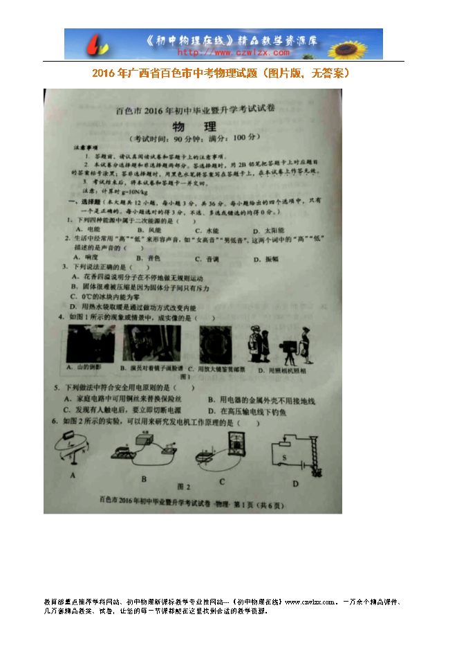 2016年广西省百色市中考物理试题(图片版,无答案)