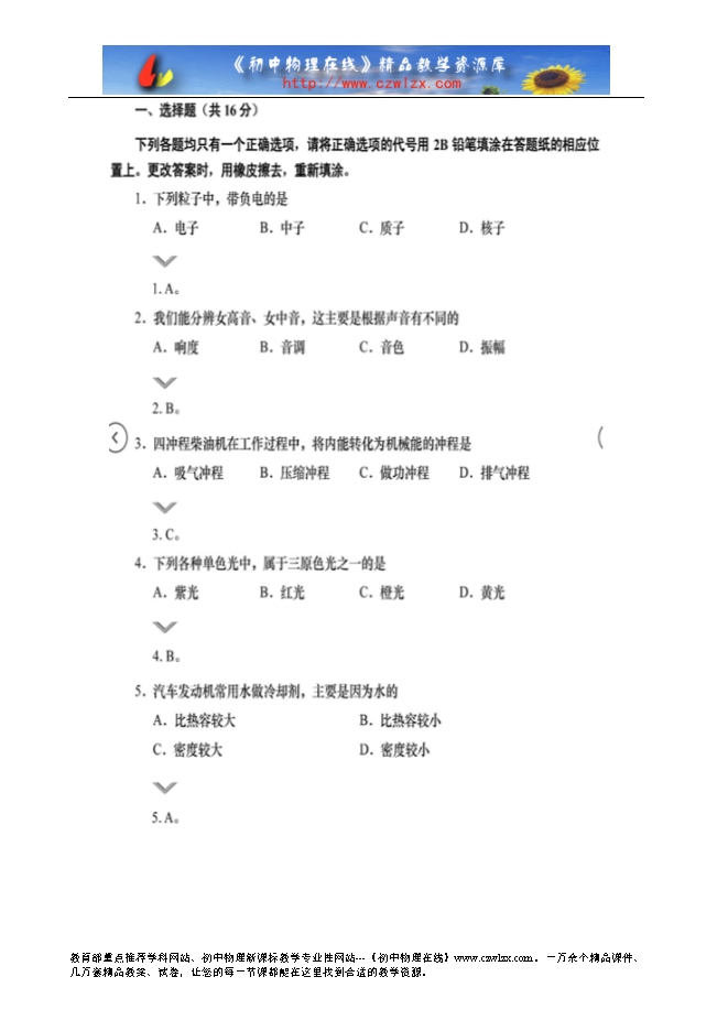 【内容简介】上海市2016年中考物理试题(图片版,附答案)